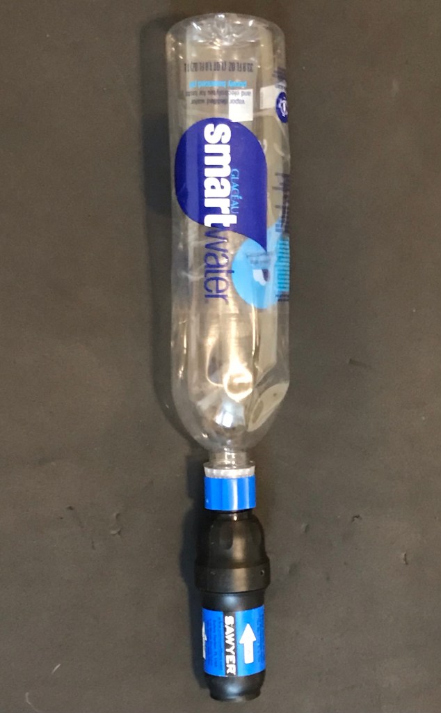 A few months ago I was talking water filters with one of my wife’s coworkers and mentioned my gripe about filling Squeeze pouches. Aaron had hiked the AT and used a Squeeze to filter his water on the trail. He had a solution. As it turns out, the threads on a Sawyer Squeeze match those on a Smart Water bottle. The bottles are flexible enough to substitute for the mylar pouches that come with the Squeeze, but rigid enough that they can be filled easily in still or slow moving water. Aaron also mentioned that a 1-Liter Smart Water bottle is the best ultralight water bottle he had found for long distance hiking, and that there is a whole bunch of info to be found on the web about hacking the Squeeze.