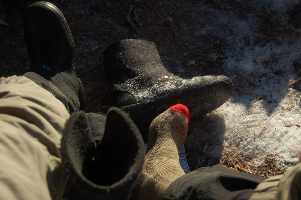 If you must venture out in 30 degree weather you’ll find that the snow is wet enough to soak through your mukluks in no time. For these conditions you need to pack a pair of Tingley galoshes. Take the wool liners out of the mukluks and put them in the rubbers. Now your insulation will be protected from the wet snow. It won’t, however, be protected from your sweaty feet. So, you should carry TWO pairs of wool liners so you have one to wear and one to dry next to the stove. Sometime during your trip both of these liners will probably freeze solid from perspiration. Not a problem. They thaw out pretty quick when you start walking. And frozen feet build character.