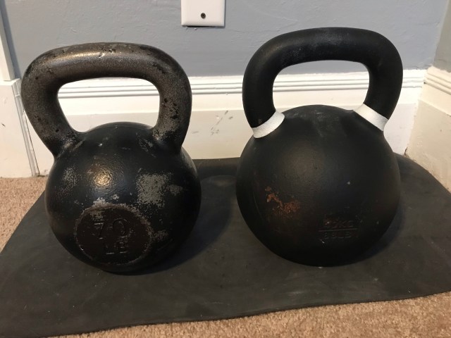 Effective, and affordable. After a couple months of walking back and forth to the fitness center each morning, I decided I would rather work out in my apartment. I bought a 35, 50 and 70 from the Walmart website, which offered free in-store pickup. Total cost was a little under $200. Later I popped for a legit 24 kg bell from Rogue, along with the next step in the progression in the series: the 40 kilo, which is just under 90 pounds. These bells, with shipping, set me back another $200 or so. That’s $400 all-in for seven years weight training. Less than five bucks a month. An absolute bargain.