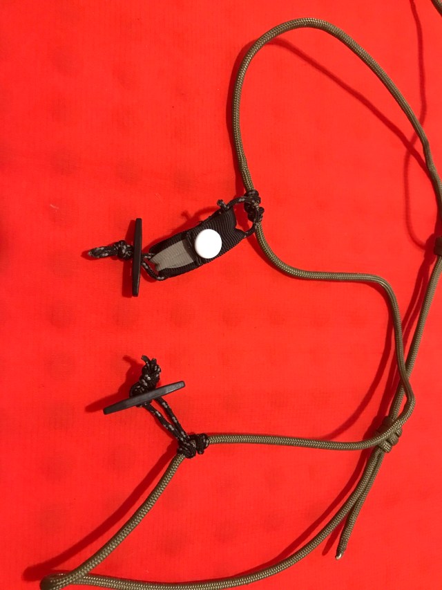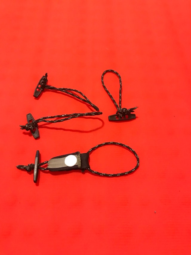 The toggles seem to hold the quilt well with the exception of the one connecting the snap to the quilt. I learned that when I undid the snap, the toggle didn’t have enough tension to stay connected to the loop on the quilt. My solution was to girth hitch the loop directly to the quilt, but larger toggles are probably in order all around. These are available commercially from vendors like Ripstop by the Roll, or could be made from sections of 1/4″ vinyl tubing.
