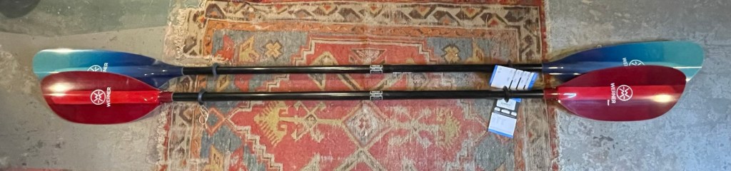These two paddles are recommended for my height and boat width, the top for a low-angle forward stroke, the bottom for a high-angle stroke. As you can see, the shaft of the “high-angle” paddle is actually longer than that of the “low-angle” paddle.