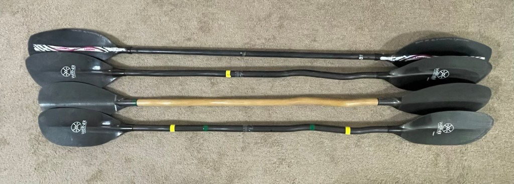 Different length paddles with the same shaft length. Top to bottom 215cm, 210cm, 208cm, 205cm.