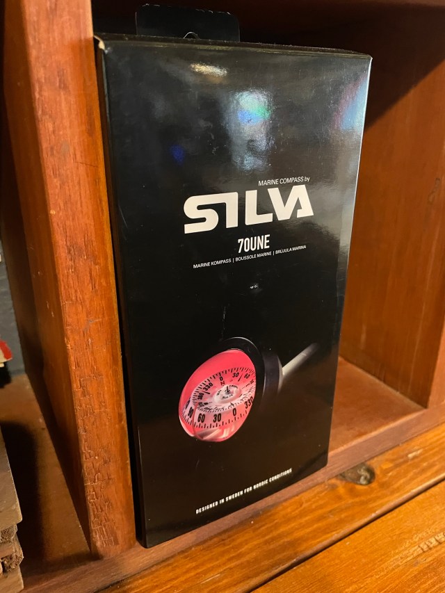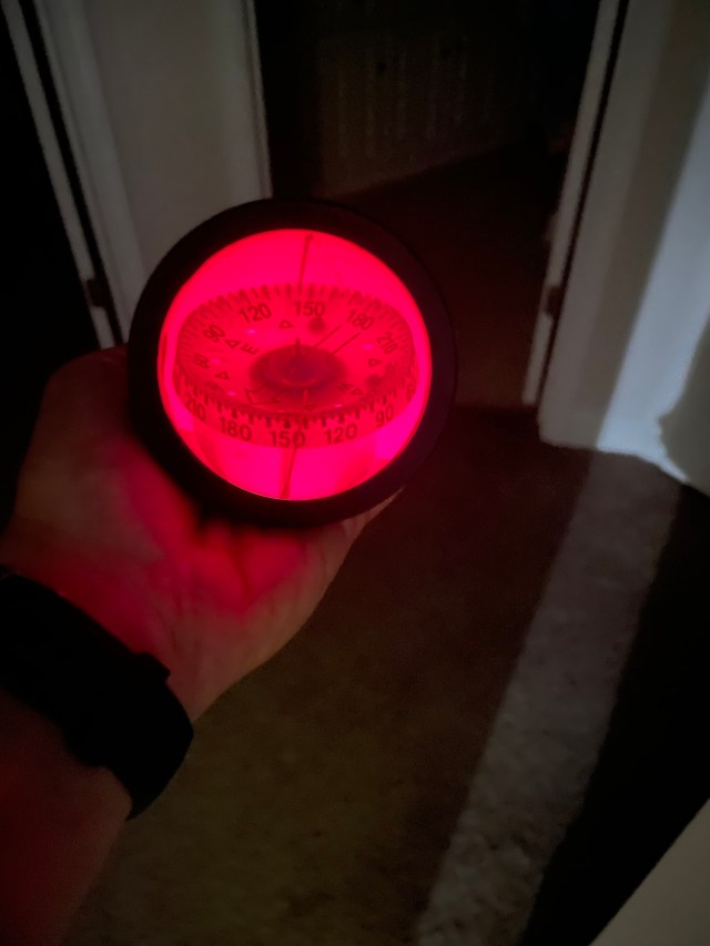 The kind of compass that we use for this sort of navigation is a nautical binnacle compass. Unlike a hiking compass, nautical compasses are designed so that the number you view on the compass card is the direction that you’re travelling. This makes it easy to stay on the proper heading by glancing down at the compass from time to time.