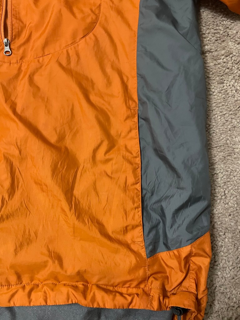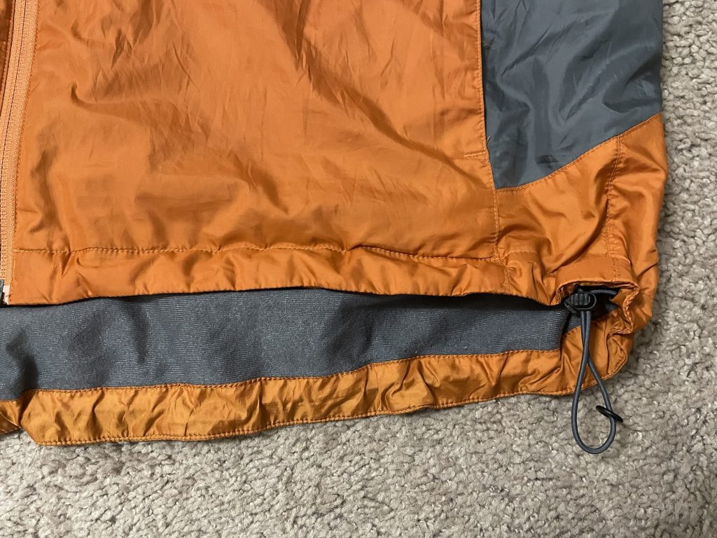 Some notes. My earlier-gen version has a minimal feature set – no bottom-hem drawcord (a major failing in my view, single pocket left chest, stout toothed zipper, mid-high collar that doesn’t fit closely around my neck. The shell material doesn’t feel very air-permeable; perhaps they changed that in later versions. There’s a much more open circle of ventilating fabric in each armpit, presumably to vent air.